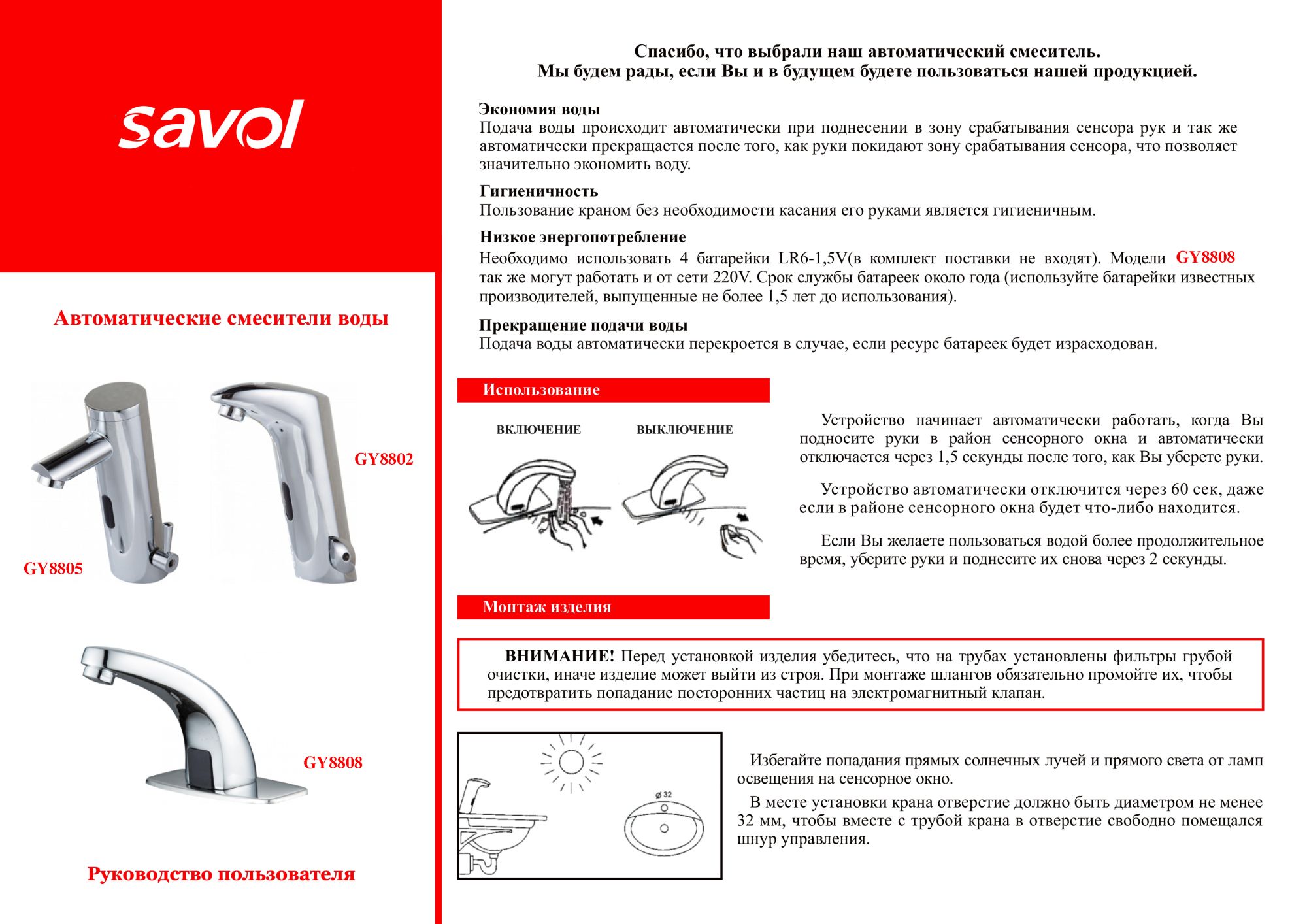 Сенсор - инфракрасный датчик для бесконтактной подачи воды.